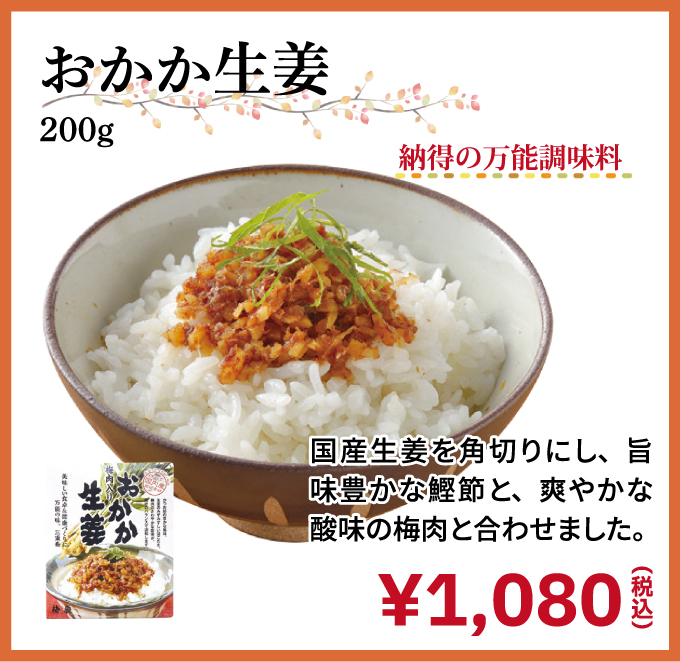 国産生姜を角切りにし、旨味豊かな鰹節と、爽やかな酸味の梅肉と合わせました。