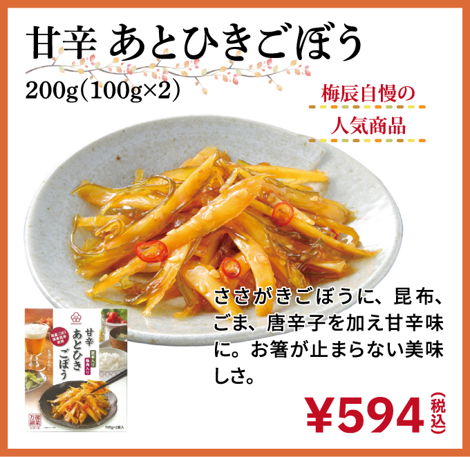 ささがきごぼうに、昆布、ごま、唐辛子を加え甘辛味に。